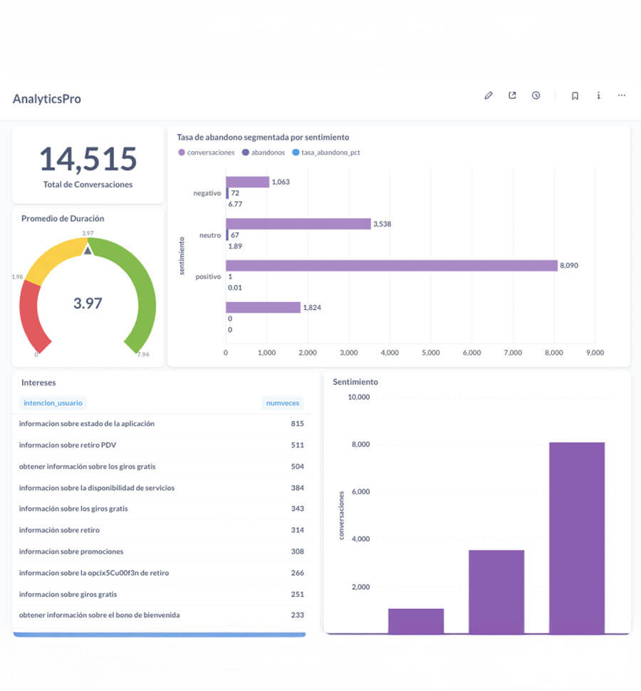 Con AnalyticPro, la IA analiza interacciones de usuarios y agentes para detectar sentimiento, atenciones e inatenciones, tasa de abandono y mucho más.